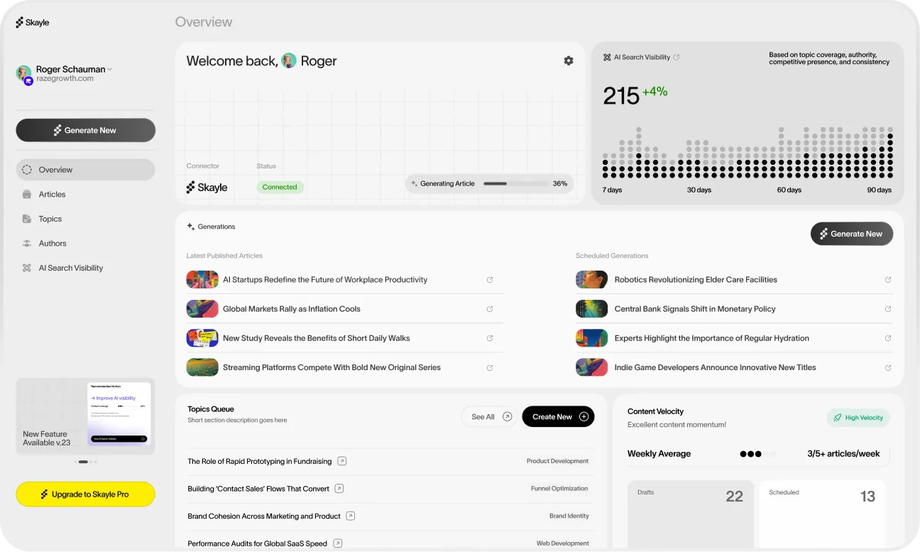 Skayle is built to replace manual content operations, not add another layer of tooling. Once connected, it continuously plans, creates, and publishes content aligned with how modern search works, without daily input from your team.